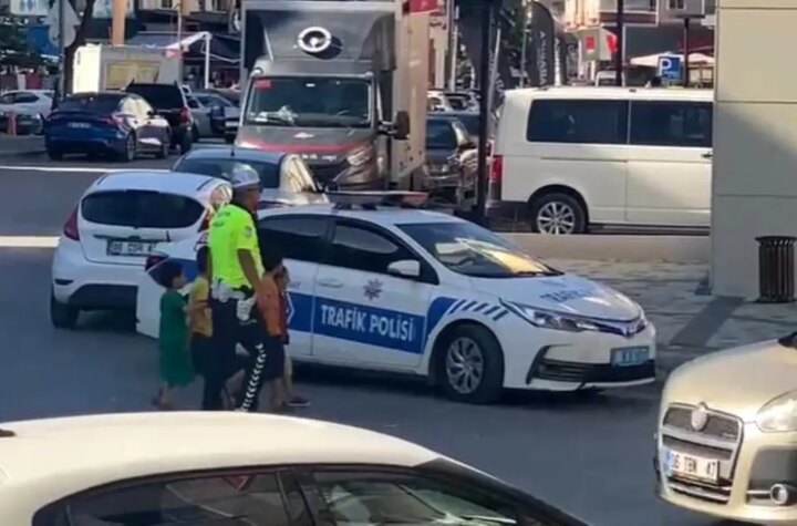 Ankara'nın Kahramankazan ilçesinde bir trafik polisi, yolun karşısına geçmek için bekleyen 4 çocuğu elinden...